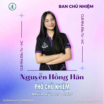 | 2. Nguyễn Hồng Hân Chức vụ: Phó Chủ Nhiệm Số ĐT: 0335290244 MSSV: 2221002969 Email: 2221002969@sv.ufm.edu.vn |