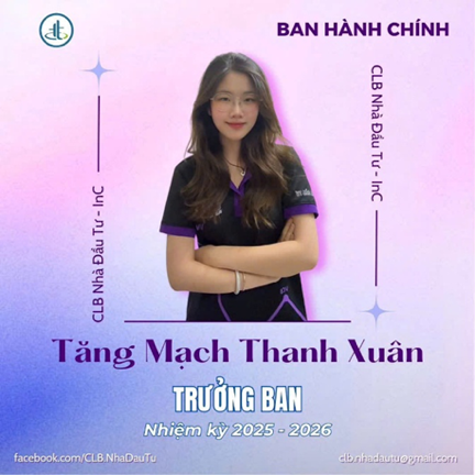 | 4. Tăng Mạch Thanh Xuân Chức vụ: Trưởng Ban Hành Chính Số ĐT: 0937422299 MSSV: 2321000376 Email: 2321000376@sv.ufm.edu.vn |