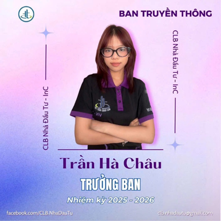 | 5. Trần Hà Châu Chức vụ: Trưởng Ban Truyền Thông Số ĐT: 0904666498 MSSV: 2321003236 Email: 2321003236@sv.ufm.edu.vn |