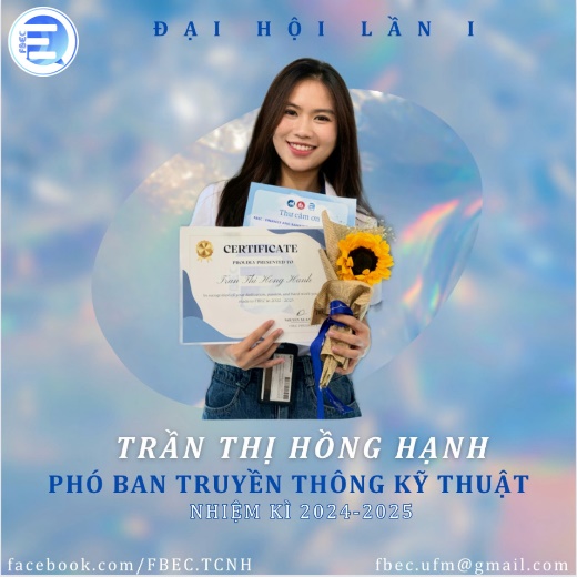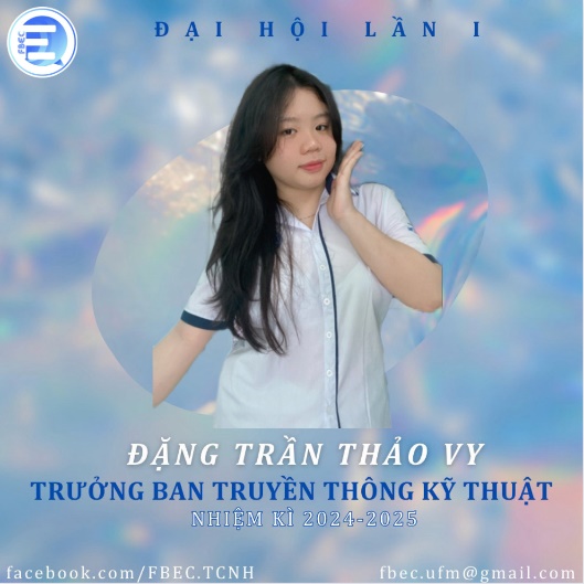 6 | Họ và tên: Đặng Trần Thảo Vy Chức vụ: Sinh viên khoa TC-NH Chức danh trong Ban điều hành: Trưởng Ban Truyền thông Kỹ thuật | |
