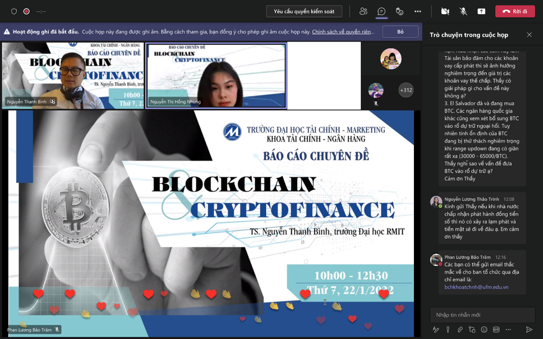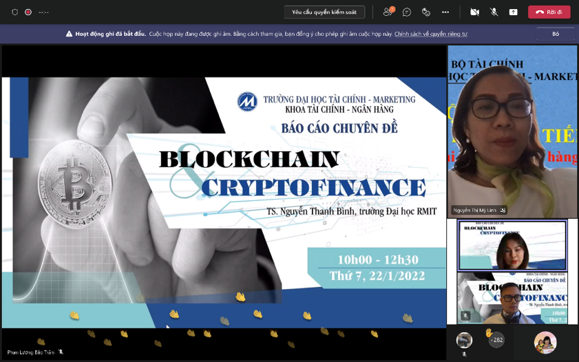 Nhằm tạo điều kiện cho các Sinh viên tiếp cận những kiến thức mới, ngày 22/1/2022, khoa Tài chính – Ngân hàng đã tổ chức buổi báo cáo chuyên đề “Blockchain and Cryptofinance” dành cho các sinh viên khóa 2019. Báo cáo chuyên đề được tổ chức online trên nền tảng trực tuyến Microsoft Team, đã thu hút sự tham gia của hơn 300 sinh viên cùng Quý Thầy Cô là giảng viên của khoa Tài chính- Ngân hàng.