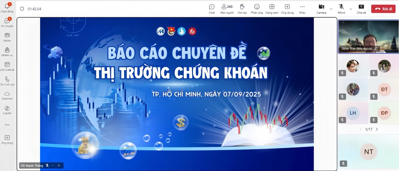 Nhằm trang bị cho sinh viên nền tảng kiến thức hiện đại, cập nhật xu thế công nghệ và định hướng nghề nghiệp phù hợp với yêu cầu của kỷ nguyên số. Vào lúc 8:00 sáng, ngày 7/9/2025 Viện Công nghệ Tài chính ngân hàng tổ chức buổi báo cáo chuyên đề về Thị trường chứng khoán với chủ đề: “Cách mạng AI và tương lai ngành chứng khoán”