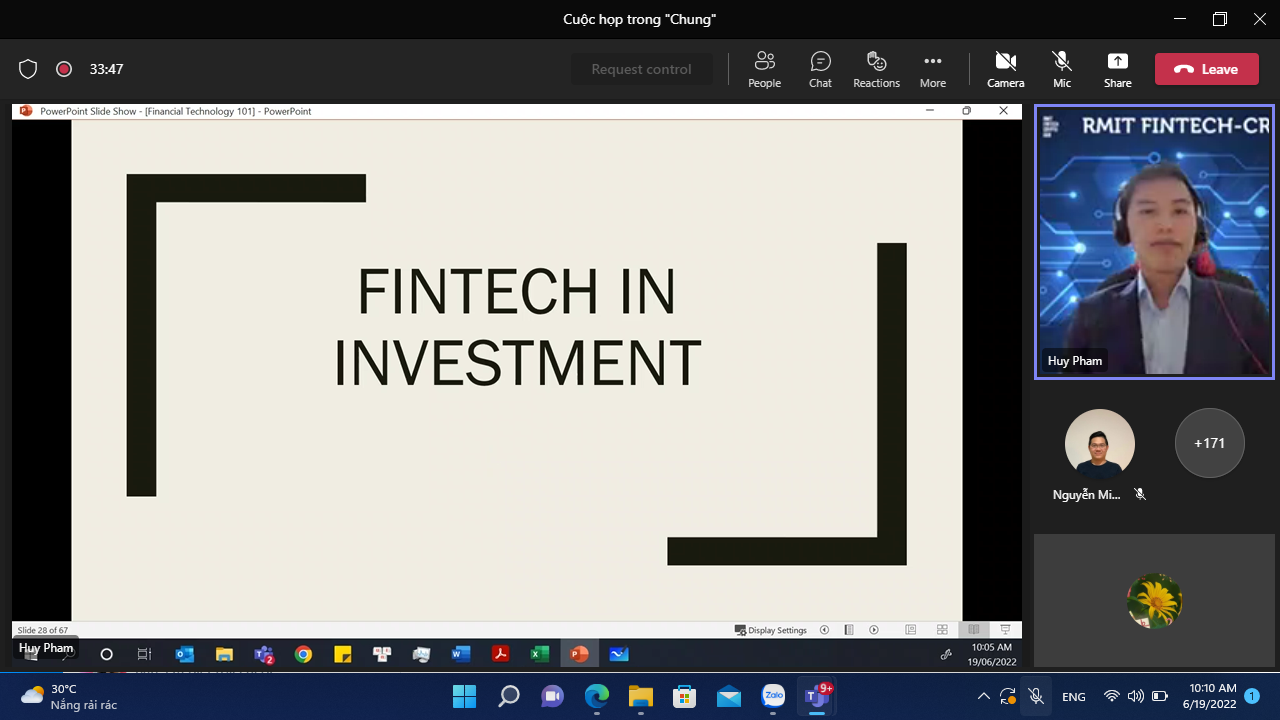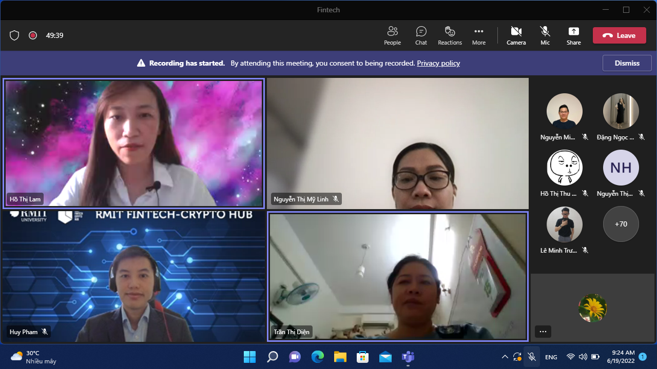 Được sự đồng ý của Ban Giám hiệu nhà trường, sáng chủ nhật ngày 19/6/2022, Khoa Tài chính – Ngân hàng phối hợp cùng Đoàn khoa Tài chính – Ngân hàng tổ chức buổi nói chuyện chuyên đề "Fintech và các ứng dụng trong lĩnh vực Tài chính - Ngân hàng" online trên nền tảng MS TEAMS. Buổi báo cáo với sự có mặt của Diễn giả TS. Phạm Nguyễn Anh Huy đến từ Trường Đại học RMIT cùng với gần 300 sinh viên và các giảng viên Khoa Tài chính – Ngân hàng.