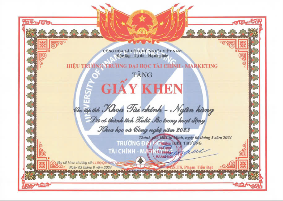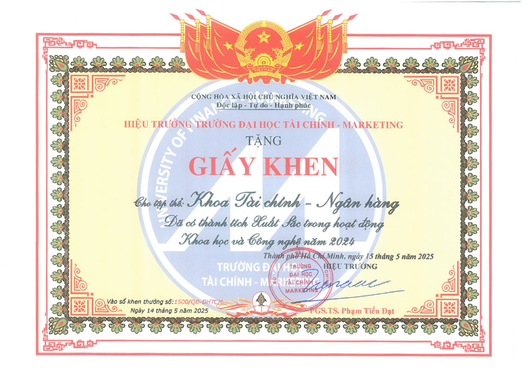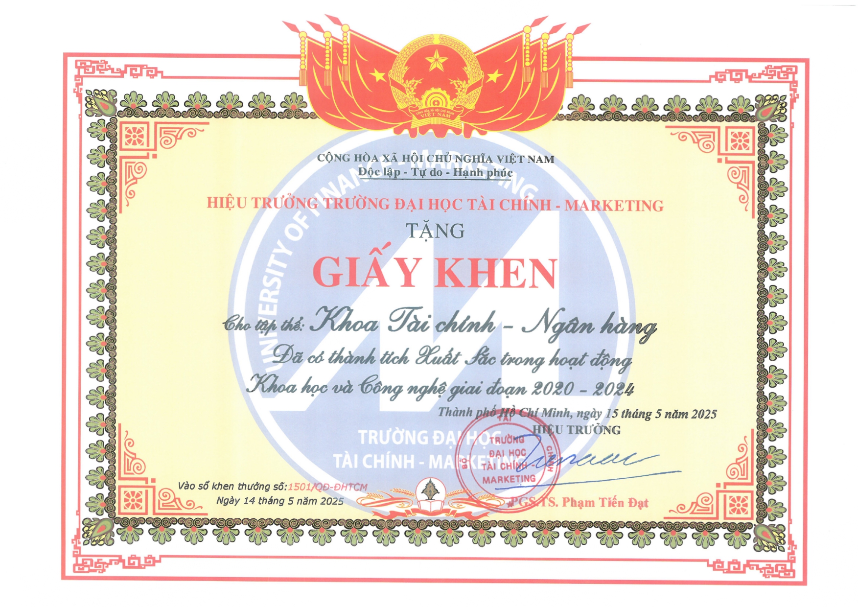 Giấy khen tập thể khoa TCNH xuất sắc trong hoạt động Khoa học và Công nghệ giai đoạn 2020 - 2024