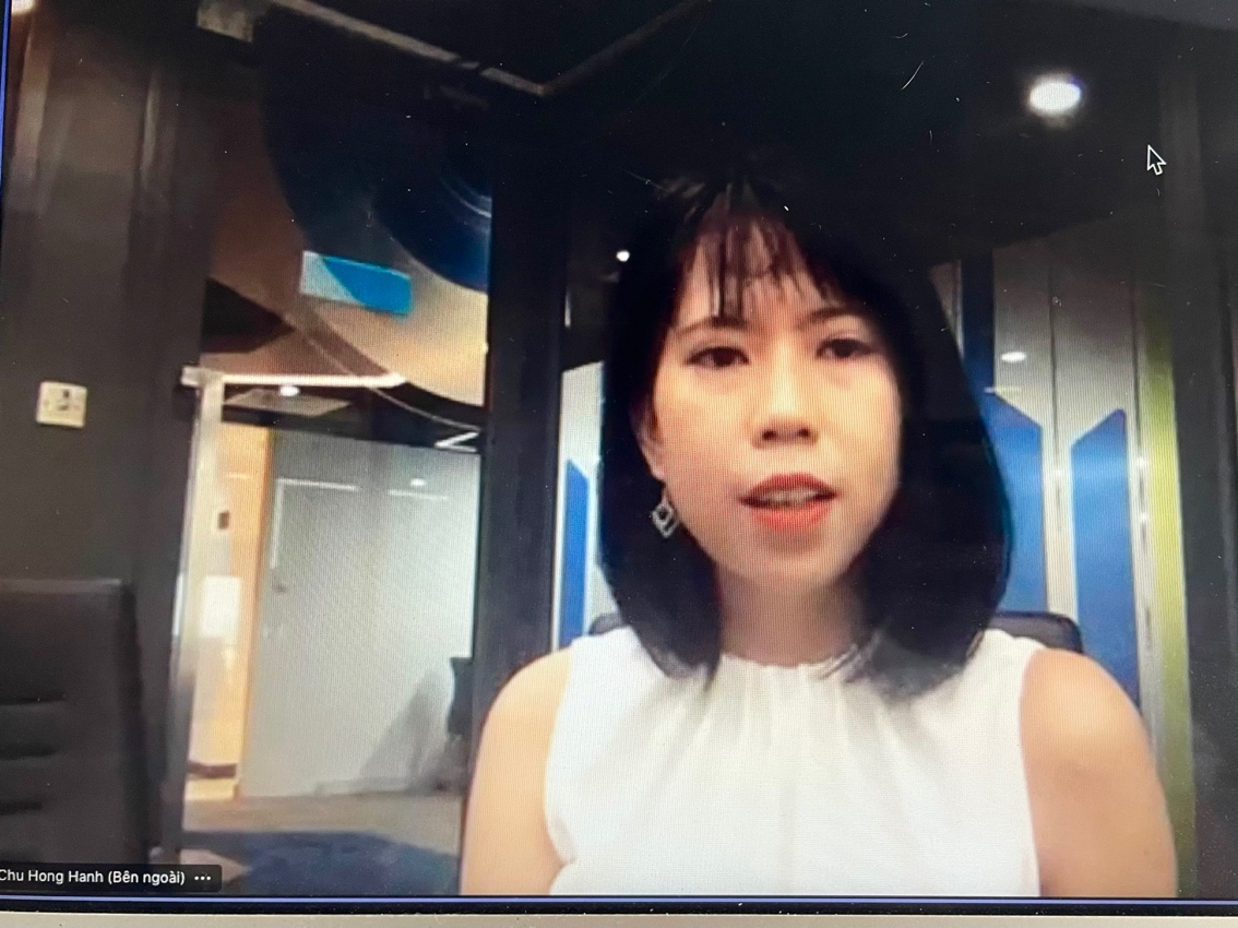 Bà Chu Hồng Hạnh trình bày báo cáo “Tương lai của ngân hàng số” và giao lưu với các em sinh viên.