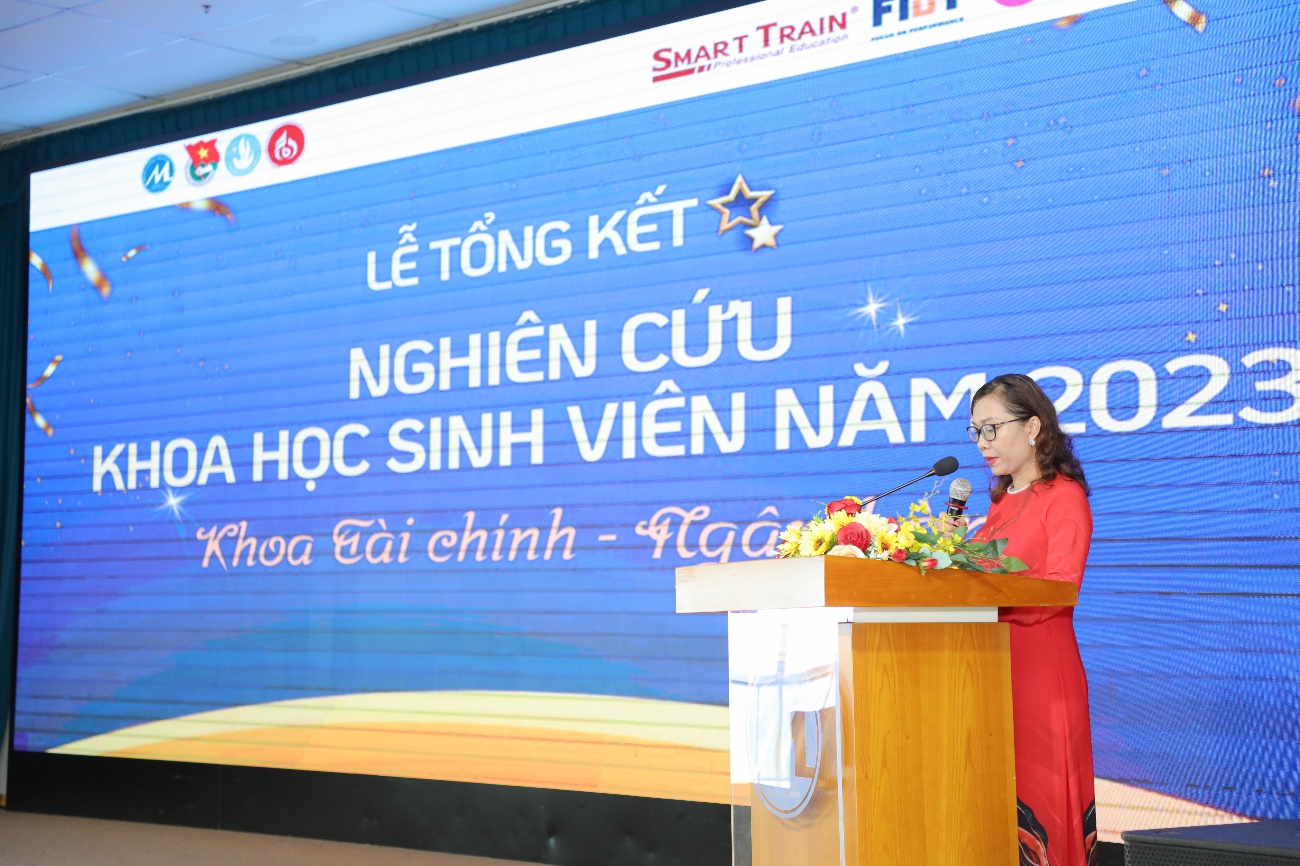 Phát biểu khai mạc và tổng kết hoạt động NCKH SV, PGS.TS. Nguyễn Thị Mỹ Linh – Trưởng Khoa Tài chính – Ngân hàng nhấn mạnh tầm quan trọng của công tác NCKH SV; đồng thời biểu dương tinh thần NCKH của các bạn SV, sự tận tình và nghiêm túc của Quý Thầy/Cô hướng dẫn. Giai đoạn 2021-2023, số lượng đề tài cũng như số lượng sinh viên tham gia NCKH ngày càng tăng. Trong ba năm qua SV khoa TCNH đã thực hiện 182 đề tài NCKH với sự tham gia của 798 SV. Ngoài ra, số lượng đề tài NCKH của SV đạt giải cao trong các cấp cũng ngày càng tăng. Năm 2021 NCKH của SV đã đạt 01 giải thưởng cấp Bộ, 01 giải ba “Olympic kinh tế lượng và ứng dụng toàn quốc”, 03 giải NCKH SV cấp trường, 10 giải cấp khoa. Năm 2022, đạt 01 giải khuyến khích “Olympic kinh tế lượng và ứng dụng toàn quốc”, 10 giải cấp khoa và 14 giải cấp trường. Năm 2023, đạt 01 giải khuyến khích “Olympic kinh tế lượng và ứng dụng toàn quốc”, 10 giải cấp khoa, 7 giải cấp trường và đang tham gia dự thi các cấp cao hơn. Bên cạnh đó, các đề tài NCKH của SV đã được công bố trên các tạp chí uy tín quốc tê uy tín Scopus Q4. Năm 2021, có 1 nhóm SV công bố trên tạp chí scpous Q4. Năm 2022, có 1 nhóm SV công bố trên tạp chí trong nước và 1 công bố trên hội thảo quốc tế. Năm 2023, đã có 3 nhóm SV công bố trên tạp chí uy tín trong nước từ 1 điểm trở lên như Tạp chí Kinh tế và Phát triển, Tạp Chí Khoa Học Đại Học Mở Thành Phố Hồ Chí Minh - Kinh tế và Quản trị Kinh doanh, và Tạp chí Khoa học Thương mại. Với những kết quả đạt được trong năm học 2023 sẽ là tiền đề để Khoa Tài chính - Ngân hàng, quý Thầy/Cô là giảng viên hướng dẫn và các SV tiếp tục phấn đấu, đặt ra kế hoạch hoạt động KHCN năm 2024.