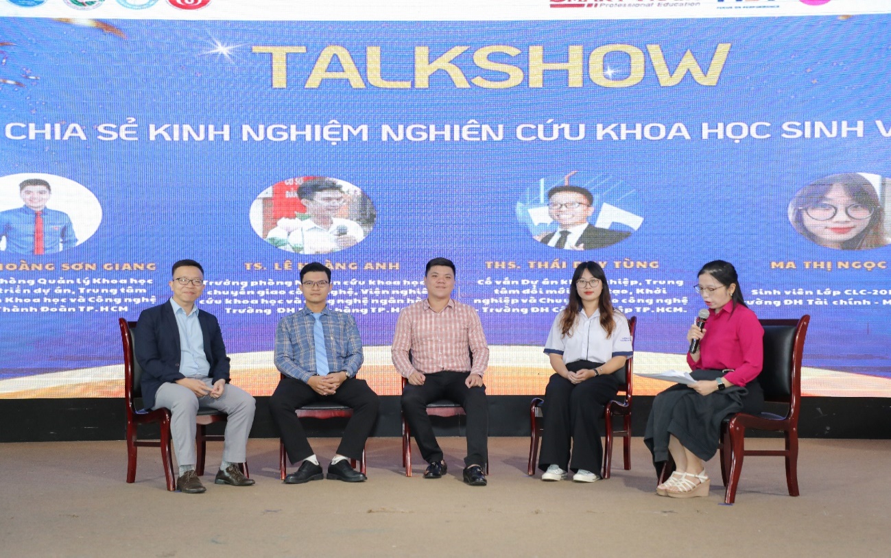 Ngoài ra, chương trình cũng tổ chức talk show giao lưu giữa SV và các chuyên gia đầu ngành nghiên cứu trong lĩnh vực kinh tế, Tài chính - Ngân hàng và cựu SV đạt thành tích cao trong các cuộc thi NCKH. Đây là cơ hội quý báu để các bạn sinh viên giao lưu, học hỏi kinh nghiệm nghiên cứu từ những chuyên gia và những người đi trước. Các diễn giả tham dự talk show gồm: Ths. Hoàng Sơn Giang -Trưởng phòng Quản lý Khoa học và phát triển dự án, Trung tâm Phát triển Khoa học và Công nghệ trẻ, Thành đoàn TP.HCM; TS. Lê Hoàng Anh - Trưởng phòng Nghiên cứu khoa học và chuyển giao công nghệ, Viện nghiên cứu Khoa học và Công nghệ ngân hàng, Trường ĐH Ngân hàng TP.HCM; Ths. Thái Duy Tùng - Cố vấn dự án khởi nghiệp, Trung tâm ĐMST, Khởi nghiệp và Chuyển giao công nghệ, Trường Đại học Công nghiệp TPHCM; và Em Ma Thị Ngọc Hà, Sinh viên lớp CLC_20DTC03, sinh viên đại diện nhóm SV đạt giải nhất NCKH SV cấp Khoa 2023.