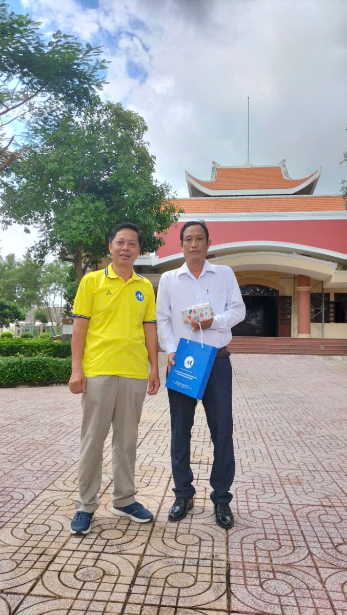 Đồng chí Lê Trung Đạo đại diện các chi bộ tặng quà lưu niệm cho Ủy Ban nhân dân xã Tân Bình và đồng chính Nguyễn Thành Trung – Phó chủ tịch xã đại diện Ủy ban tặng quà cho các chi bộ đến viếng khu di tích