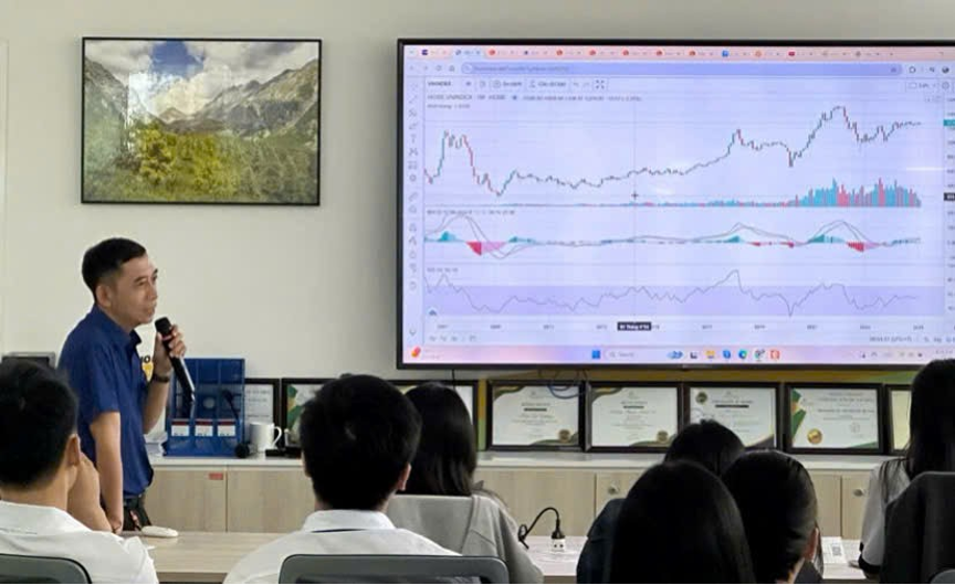 Hình 1: Chuyên gia hướng dẫn sinh viên phân tích biểu đồ kỹ thuật tại Công ty Chứng khoán Phú Hưng