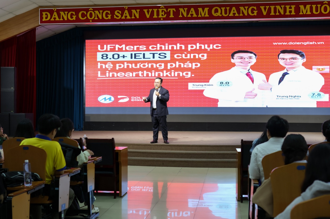 Hình 2: Các bạn sinh viên UFM hào hứng với chia sẻ của thầy Trần Thiện Minh về phương pháp Linearthinking chinh phục IELTS 8.0+