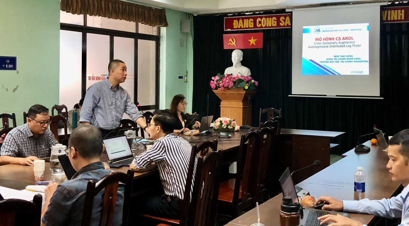 Tại buổi tọa đàm, các tham luận chuyên sâu đã nhận được sự quan tâm, đặc biệt là tham luận của PGS.TS Ngô Thái Hưng, trình bày về phương pháp dữ liệu bảng CS ARDL, cung cấp nền tảng lý thuyết và ứng dụng thực tiễn cho các mô hình kinh tế lượng trong nghiên cứu tài chính.
