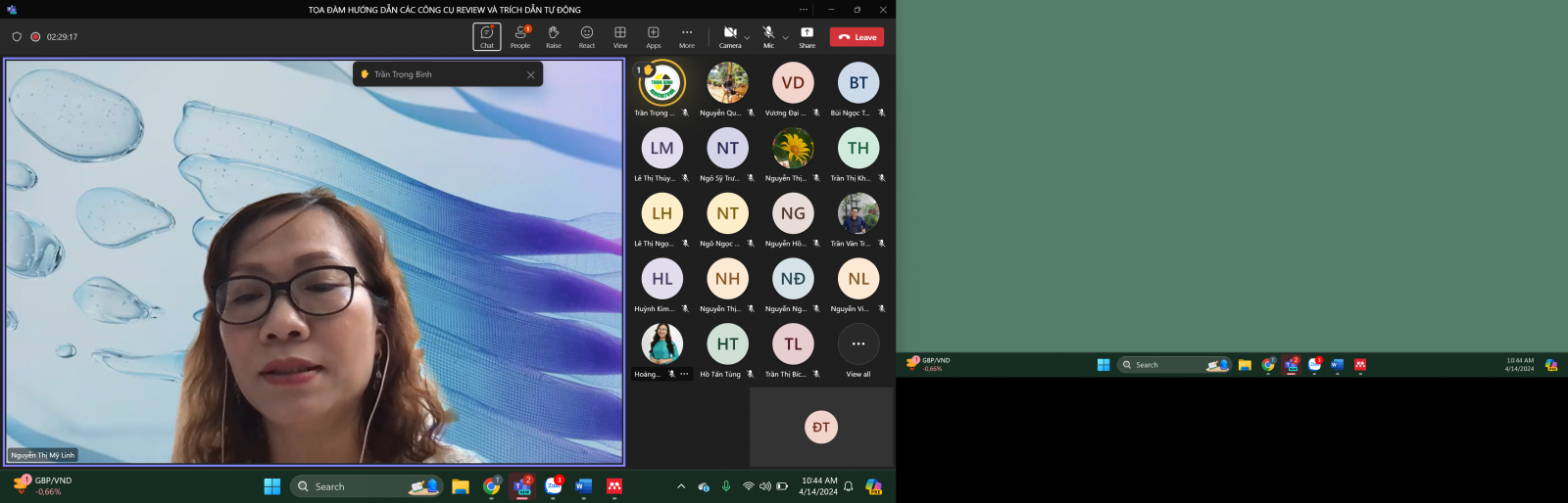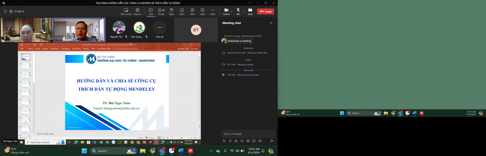 Với mong muốn hỗ trợ các học viên sau đại học tiếp cận với những công cụ hữu ích cho hoạt động nghiên cứu khoa học, Khoa Tài chính - Ngân hàng (TCNH), Trường Đại học Tài chính – Marketing đã tổ chức tọa đàm với chủ đề “Hướng dẫn các công cụ review và trích dẫn tự động” vào lúc 8h30 ngày 14/04/2024. Tọa đàm được điều hành bởi PGS.TS.Nguyễn Thị Mỹ Linh – Trưởng khoa Tài chính - Ngân hàng, với sự tham gia của hai diễn giả là TS. Bùi Ngọc Toản, giảng viên khoa TCNH và Ths. Phạm Minh Tiến, chuyên viên tạp chí Nghiên cứu Tài chính – Marketing.