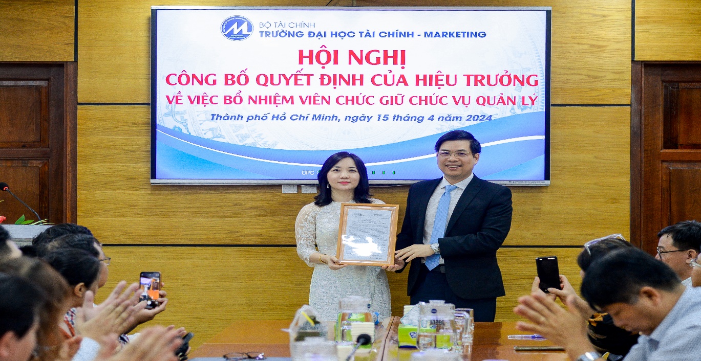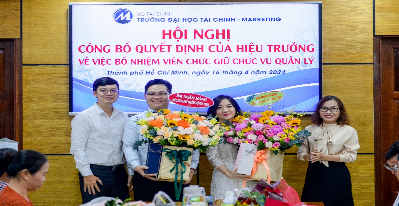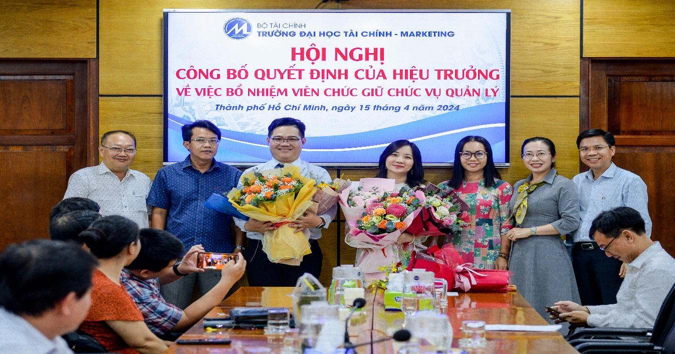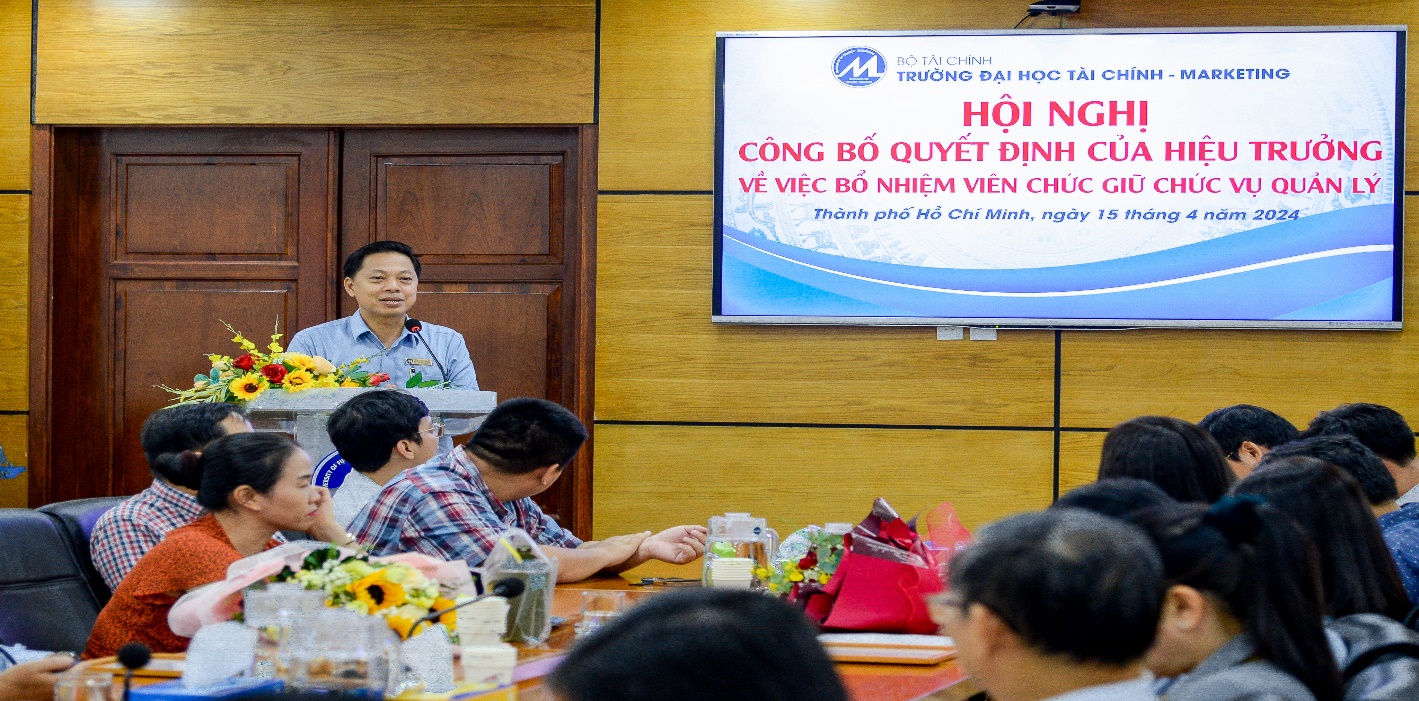 Sáng ngày 15/4/2024, Trường Đại học Tài chính - Marketing đã tổ chức Hội nghị công bố các Quyết định của Hiệu trưởng về việc bổ nhiệm chức vụ quản lý đối với các viên chức quản lý Khoa Tài chính – Ngân hàng. Tham dự Hội nghị có sự hiện diện của PGS.TS Hồ Thủy Tiên, Bí thư Đảng ủy, Chủ tịch Hội đồng trường; PGS.TS Phạm Tiến Đạt, Hiệu trưởng Nhà trường; TS. Lê Trung Đạo, phó hiệu trưởng; TS Cao Tấn Huy, phó hiệu trưởng; TS Nguyễn Xuân Hiệp, chủ tịch công đoàn trường và các thầy cô là lãnh đạo các đơn vị, đoàn thể thuộc Trường cùng giảng viên, viên chức Khoa Tài chính – Ngân hàng.