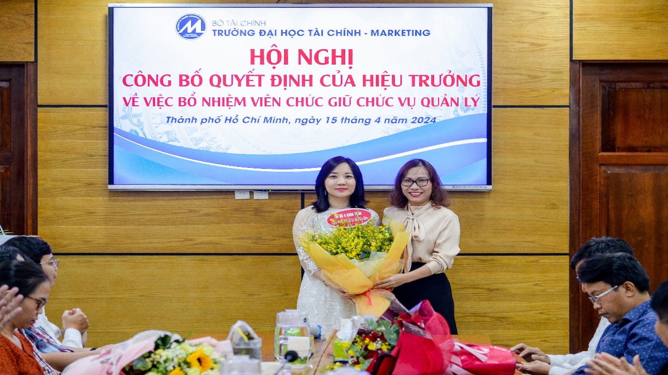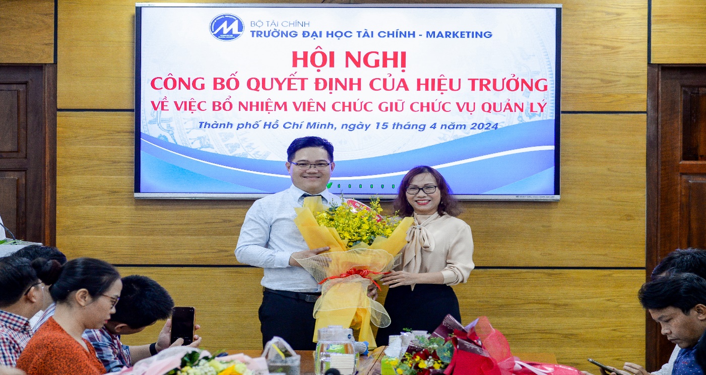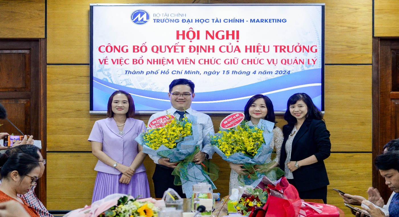 Sáng ngày 15/4/2024, Trường Đại học Tài chính - Marketing đã tổ chức Hội nghị công bố các Quyết định của Hiệu trưởng về việc bổ nhiệm chức vụ quản lý đối với các viên chức quản lý Khoa Tài chính – Ngân hàng. Tham dự Hội nghị có sự hiện diện của PGS.TS Hồ Thủy Tiên, Bí thư Đảng ủy, Chủ tịch Hội đồng trường; PGS.TS Phạm Tiến Đạt, Hiệu trưởng Nhà trường; TS. Lê Trung Đạo, phó hiệu trưởng; TS Cao Tấn Huy, phó hiệu trưởng; TS Nguyễn Xuân Hiệp, chủ tịch công đoàn trường và các thầy cô là lãnh đạo các đơn vị, đoàn thể thuộc Trường cùng giảng viên, viên chức Khoa Tài chính – Ngân hàng.