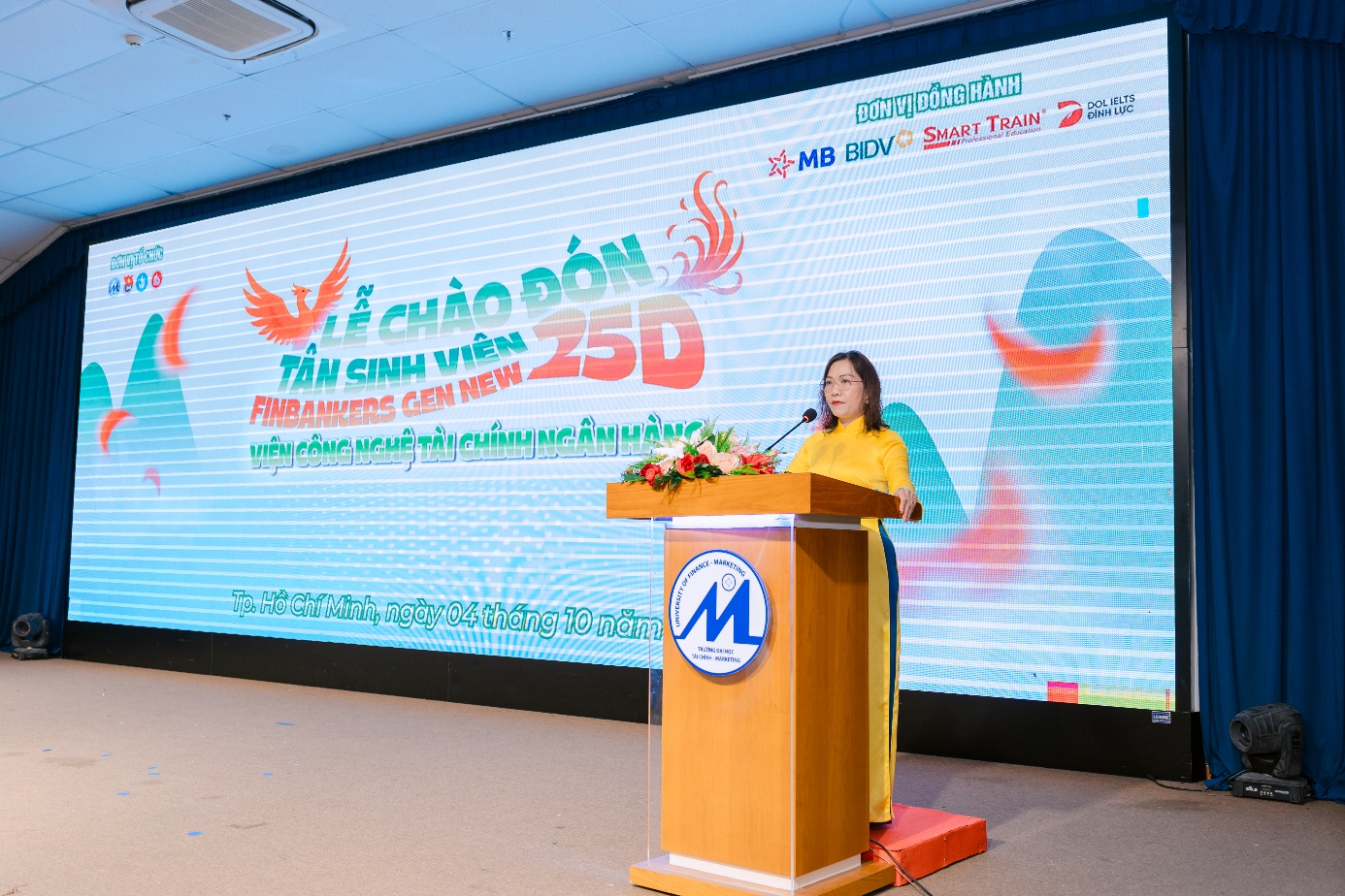 Mở đầu chương trình, PGS.TS Nguyễn Thị Mỹ Linh – Viện trưởng Viện Công nghệ tài chính ngân hàng phát biểu chào mừng, gửi gắm lời chúc tốt đẹp đến các tân sinh viên và chia sẻ định hướng phát triển của Viện trong năm học mới.